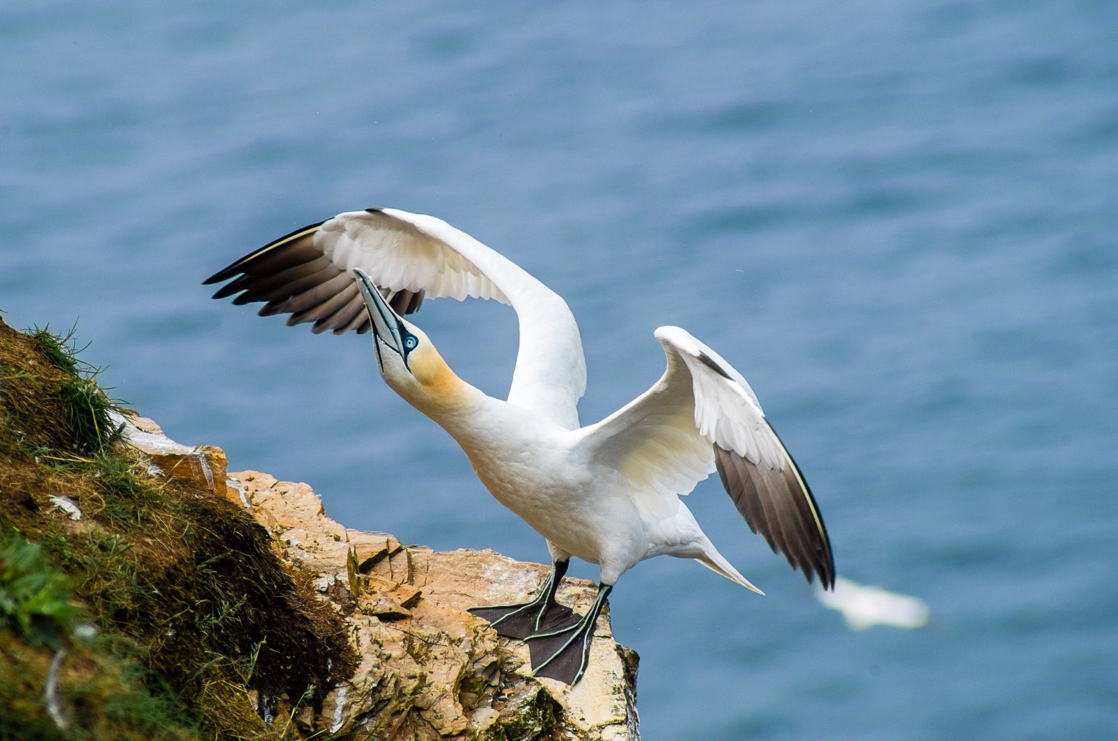 Photo: A Northern Gannet displays its plumage as it lands on a rocky outcrop. Credit: Axel Gillam