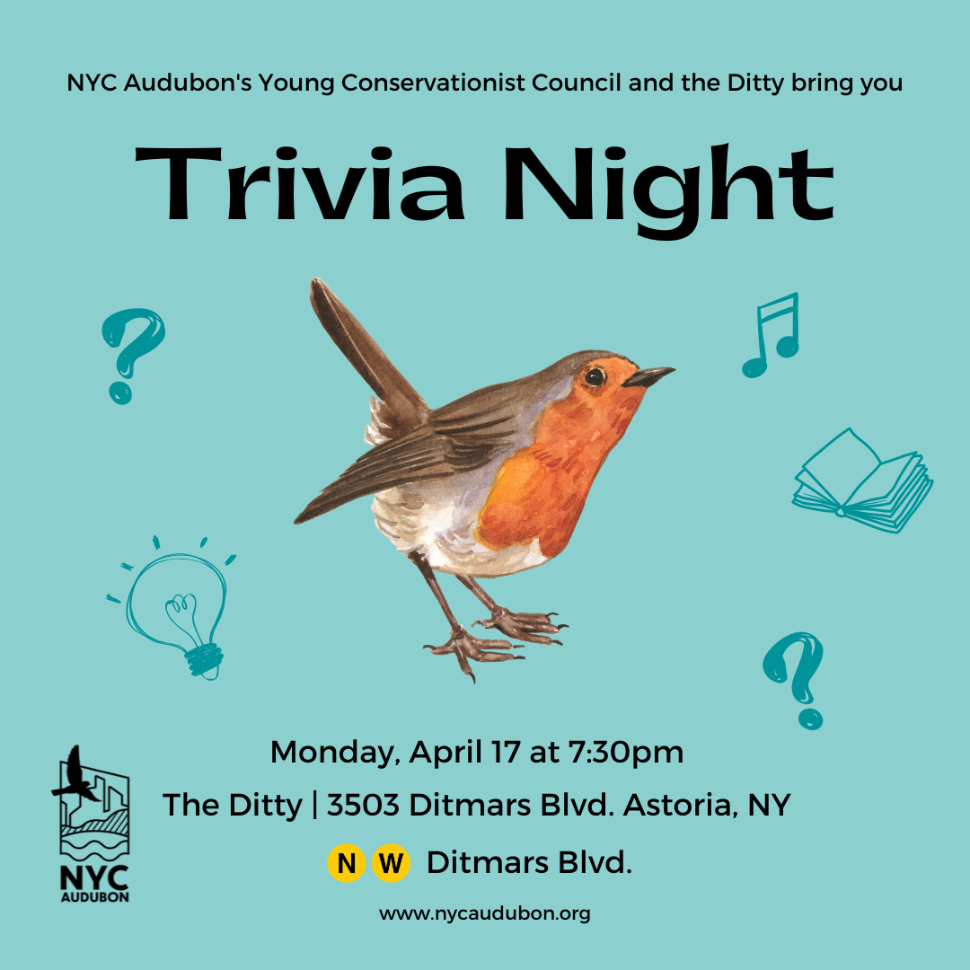 Spring is back, and so is Young Conservationist Trivia Night! Join us at The Ditty in Astoria, Queens to test your bird-related knowledge and hopefully win some prizes! Enter on your own or as a team (creative team names definitely encouraged!).