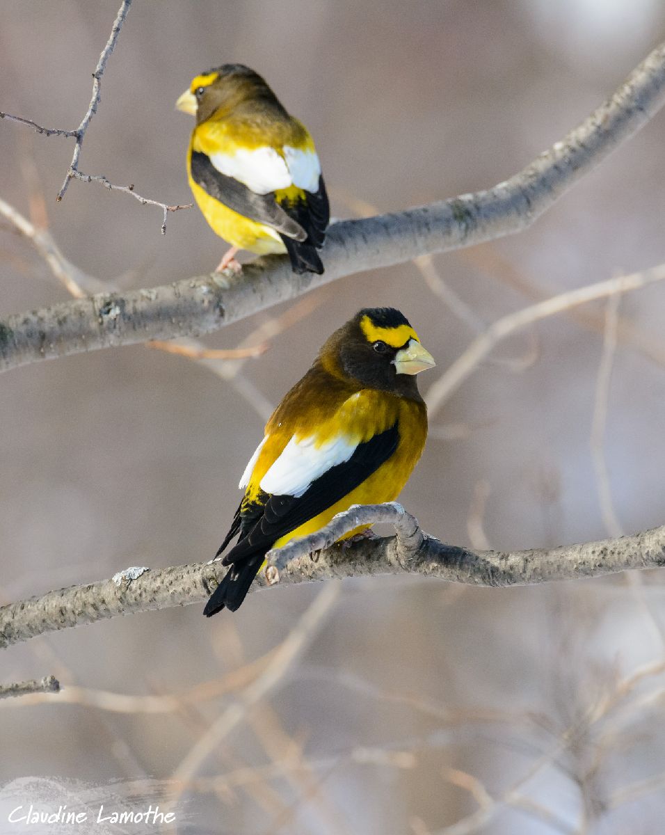 Photo: A pair of Evening Grosbeak perched on naked branches. Credit: Claudine Lamothe