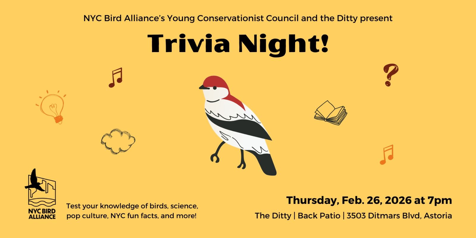 Young Conservationist Trivia Night is back in Astoria! Join us for a friendly trivia competition at The Ditty (3503 Ditmars Blvd, Astoria, Queens - back patio) to test your knowledge on a range of topics, from birds and science to pop culture, NYC fun facts, and more. Enter on your own or as a team of up to 6, and hopefully win some prizes!