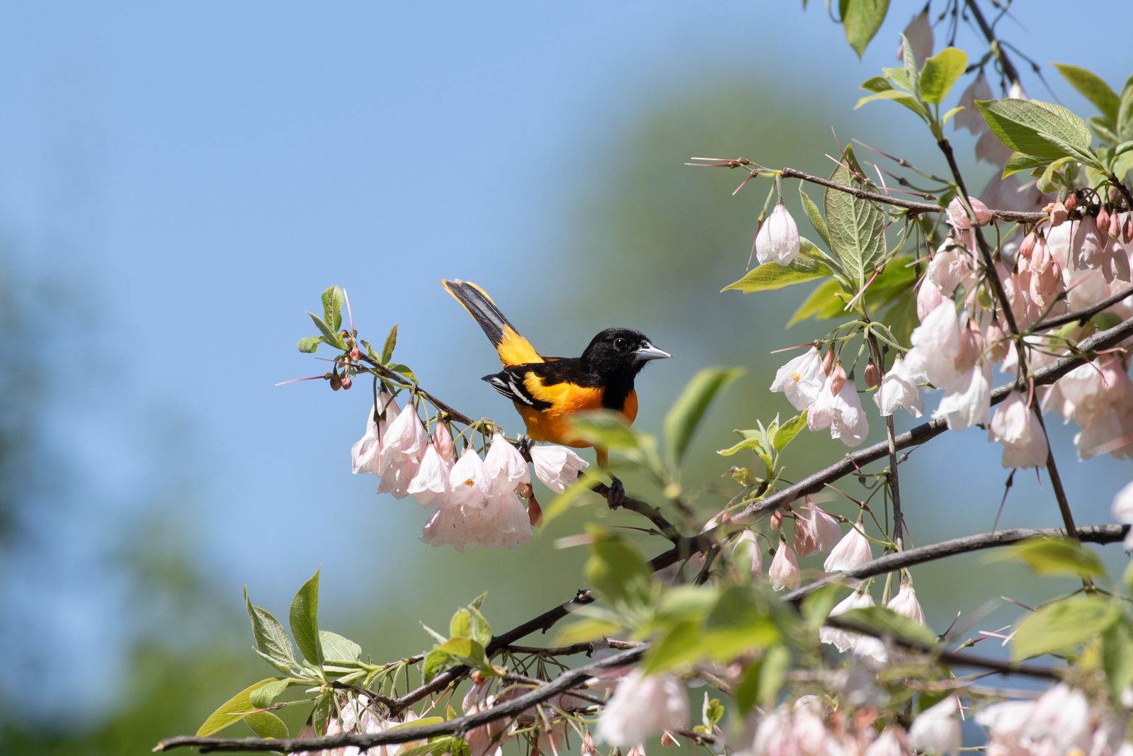 Photo: A Baltimore Oriole perched on a thin tree branch covered in pale pink blossoms found in Prospect Park. Credit: Ryan Mandelbaum