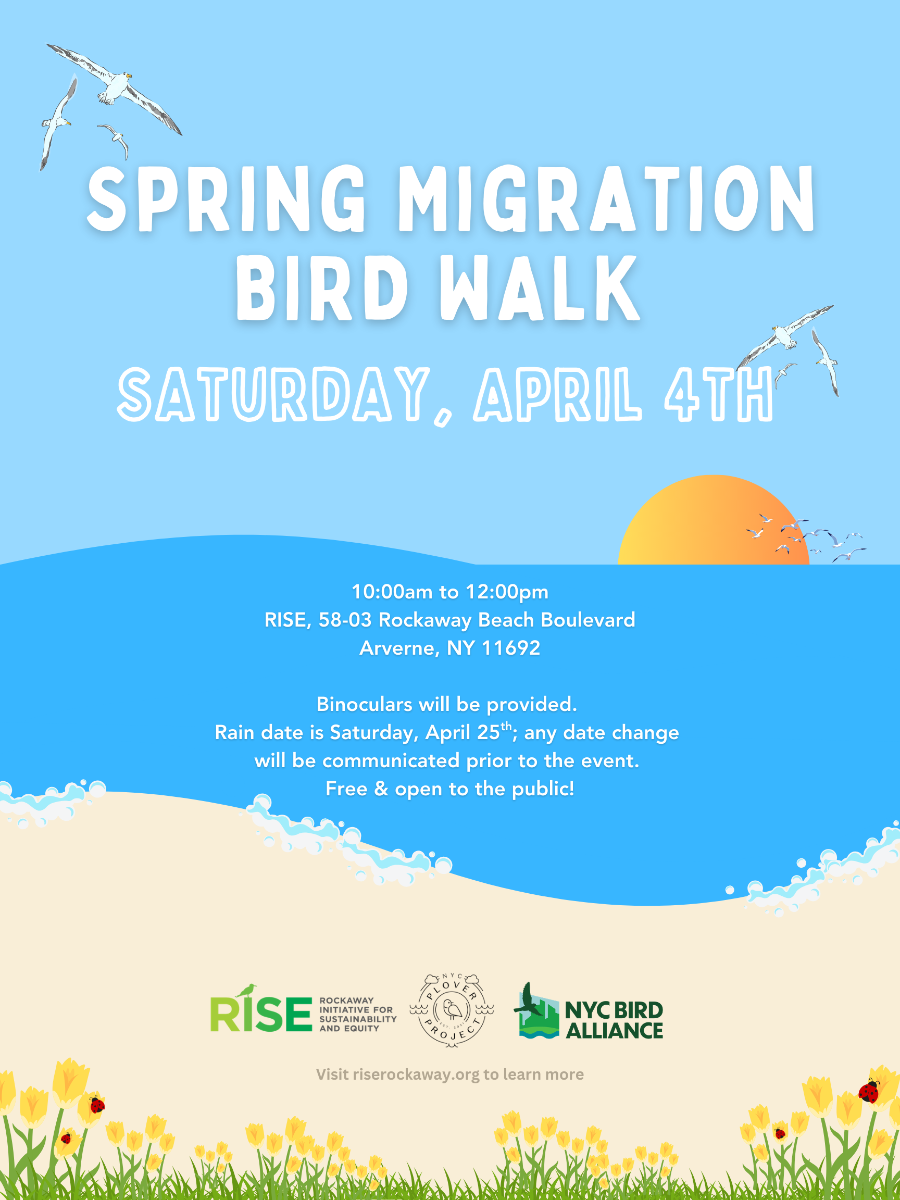 Join NYC Bird Alliance, RISE and NYC Plover Project for a FREE guided birding tour along the Rockaway shoreline! Explore the beach with expert guides and discover a wide variety of coastal birds, while learning about their habitats and conservation.