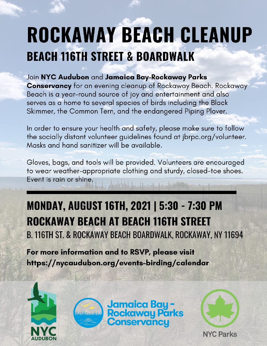 Join New York City Audubon, in partnership with New York City Parks and Jamaica Bay-Rockaway Parks Conservancy, in an evening of beautifying the gem that is Rockaway Beach. The cleanup will focus on the beach and boardwalk area.