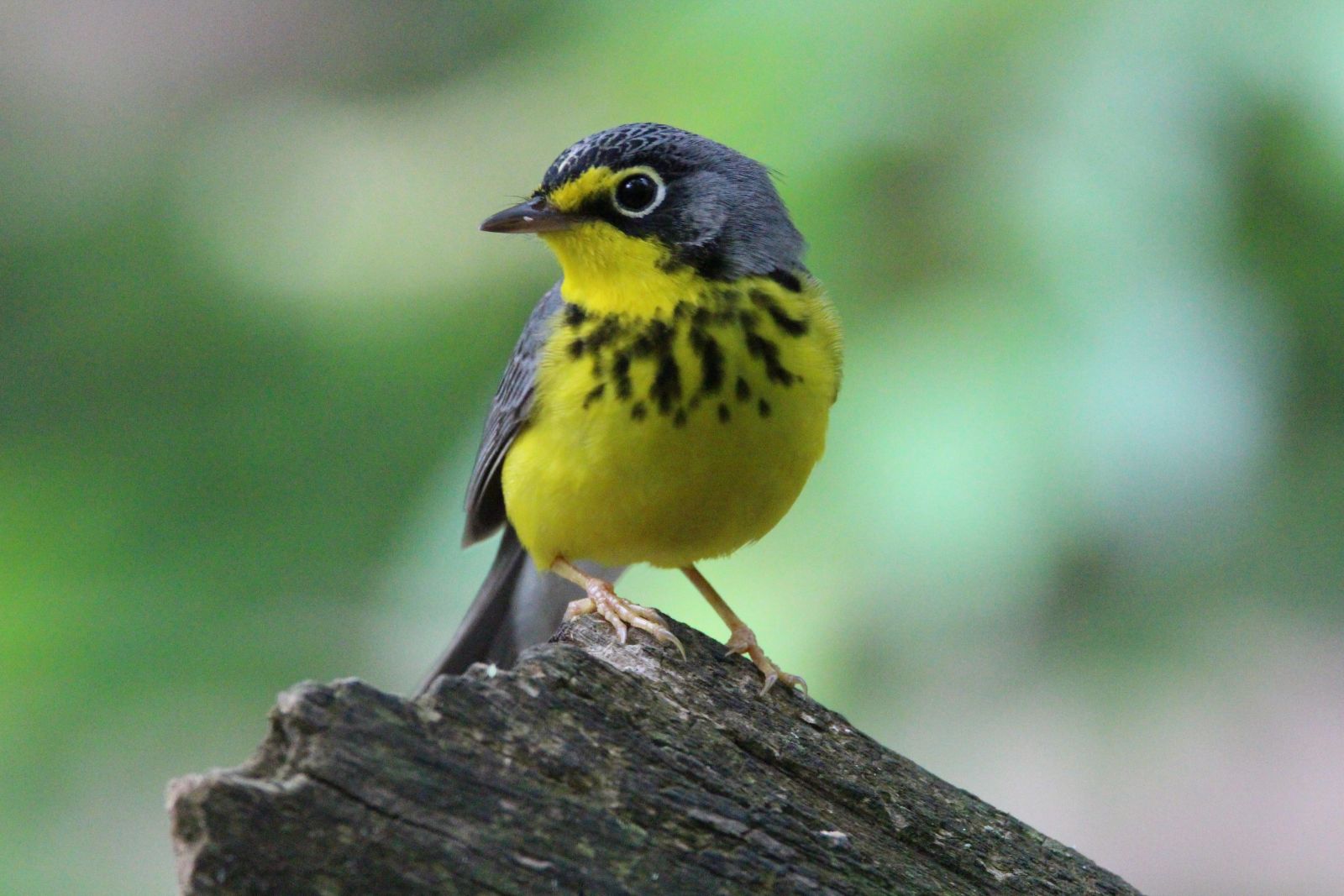 Photo: A male Canada Warbler displays its yellow and white "spectacles" and black necklace as it perches atop a rock. Credit: Dave Ostapiuk