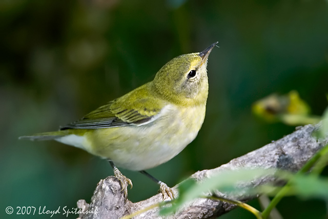 Photo: A perched Tennessee Warbler shows off its shimmering yellow-green crown and back. Credit: Lloyd Spitalnik