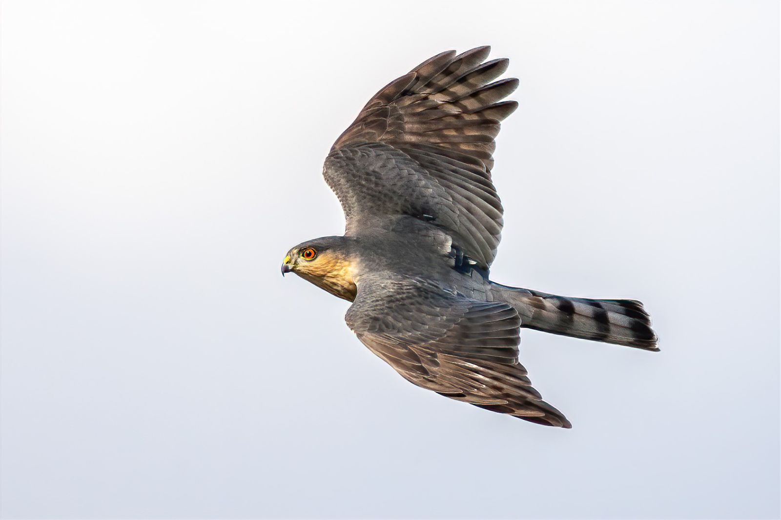 Photo: A Sharp-shinned Hawk's straight-edged tail, visible here as it flies, is a helpful field mark. Credit: Lloyd Spitalnik