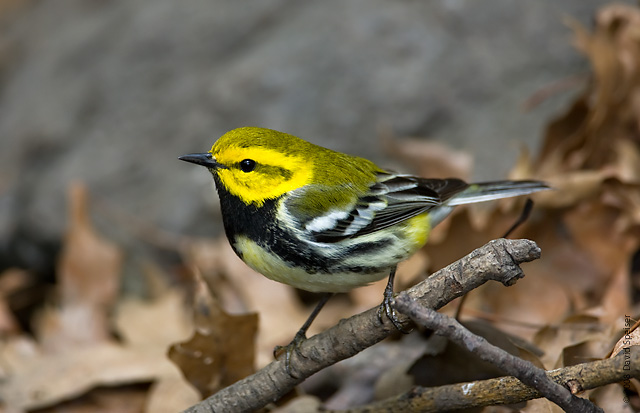Photo: The bright yellow cheek and black throat and flanks of the male Black-throated Green Warbler stand out against the fallen leaves. Credit: David Speiser